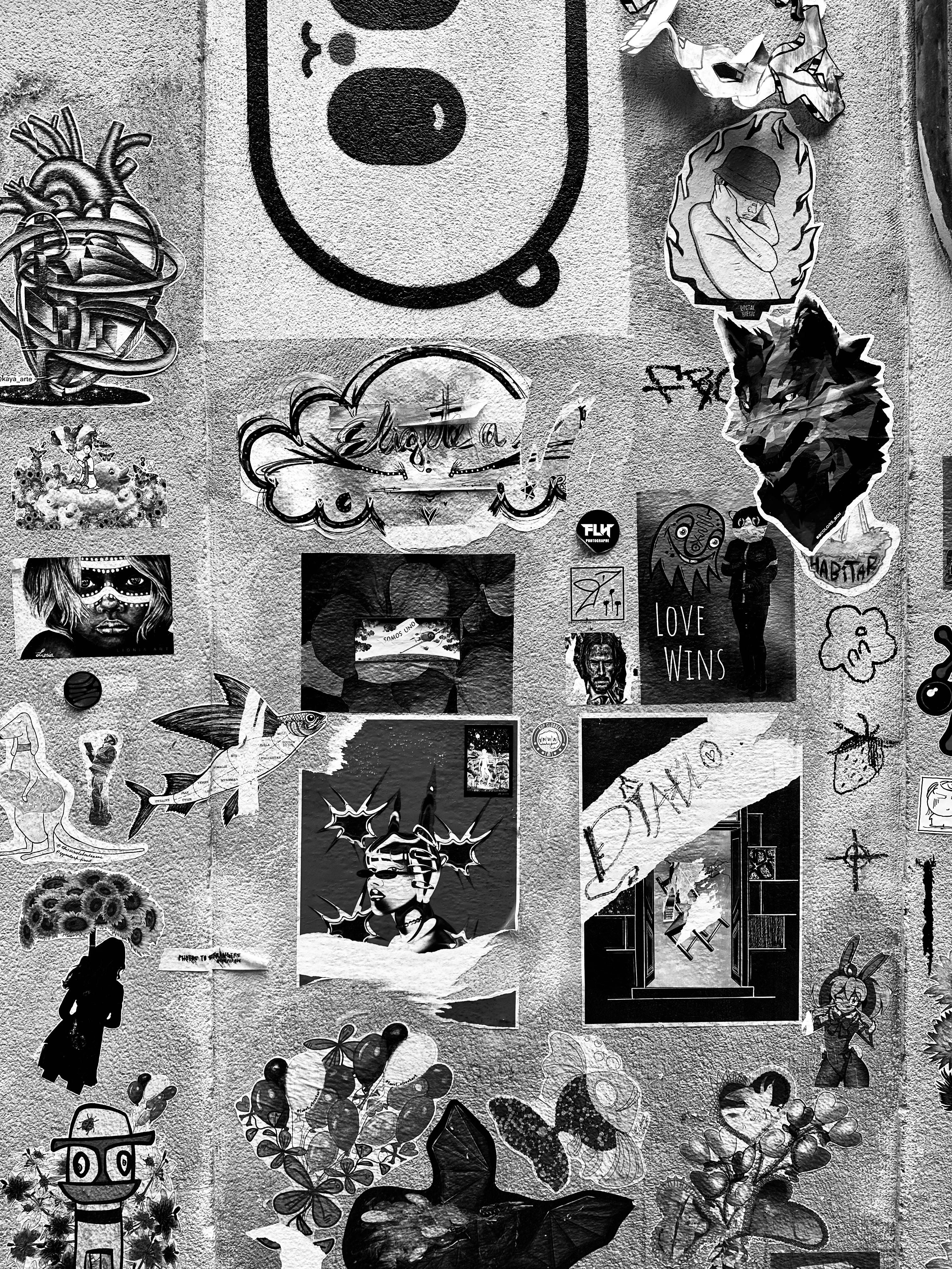 Barcelona, a city celebrated for its vibrant culture and artistic flair, often reveals its truest colours even in shades of grey. This intricate monochrome photograph captures a segment of a wall, transformed into a captivating collage of stickers, stencils, and graffiti, reflecting the city's dynamic str…