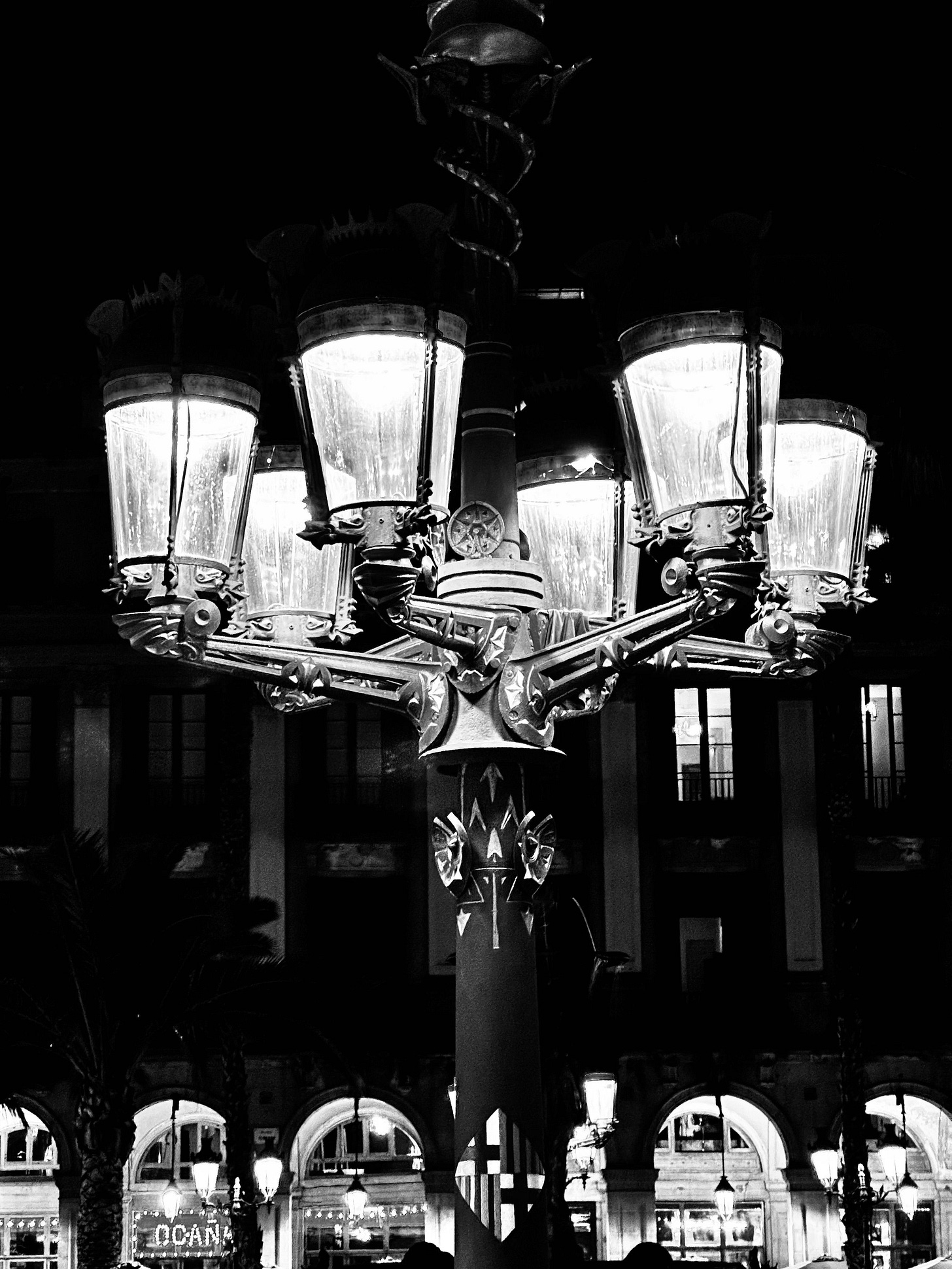 The upward perspective makes the lamppost loom large, establishing it as a monumental beacon. Below, the dark, arched facades of the square’s perimeter are subtly lit, giving just a glimpse of the famous terraces, like Ocana, that ring the plaza. The depth of the black sky and the intense white light create a palpable sense of nocturnal drama.